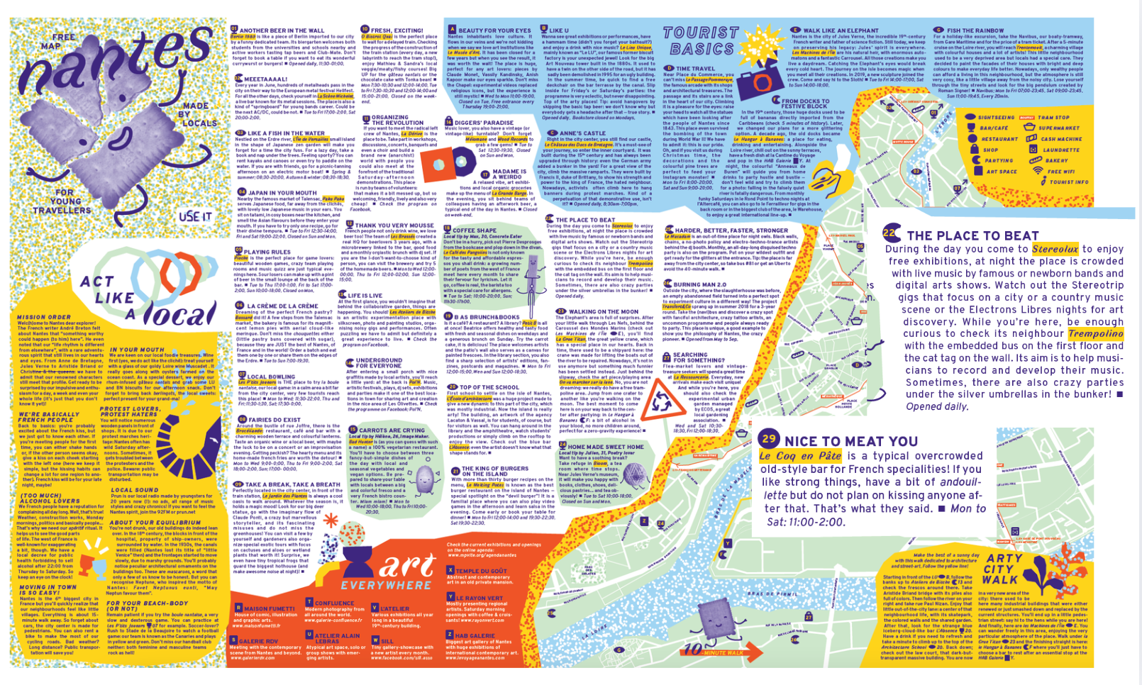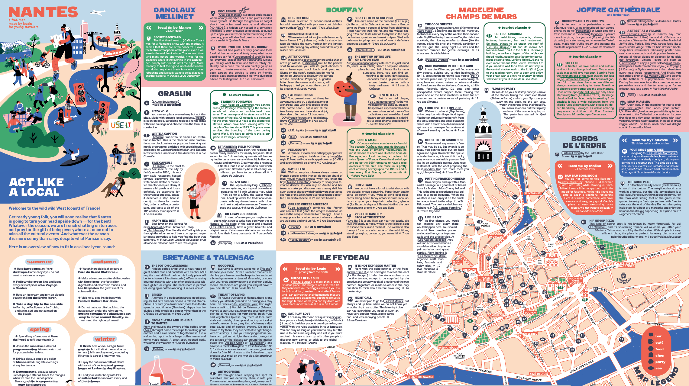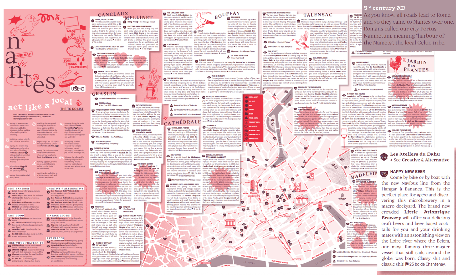 Gestion de projet, community management, relations partenaires, rédaction in English pour les rubriques et une partie des lieux référencés, relecture et mise en cohérence, release party & diffusion, promotion et sponsorisation de la version numérique disponible sur use-it.travel/nantes.